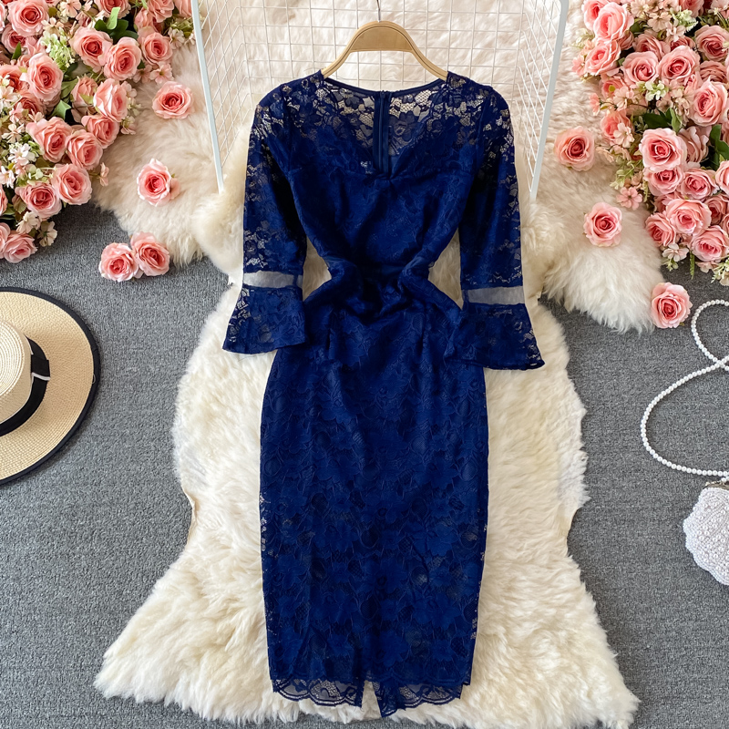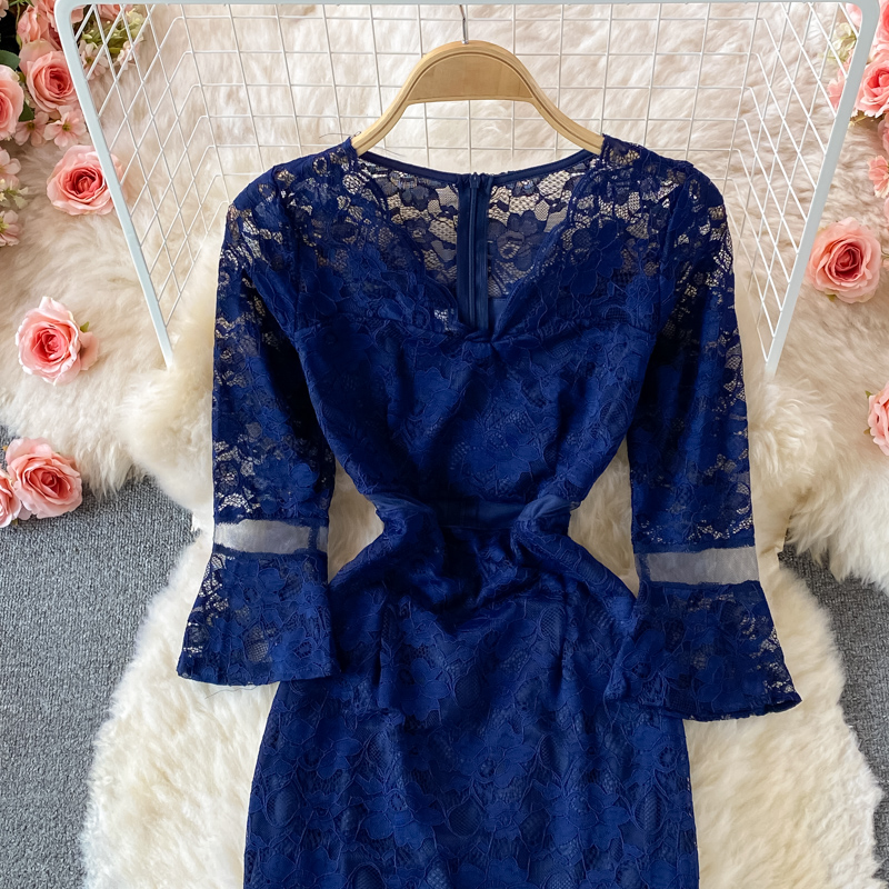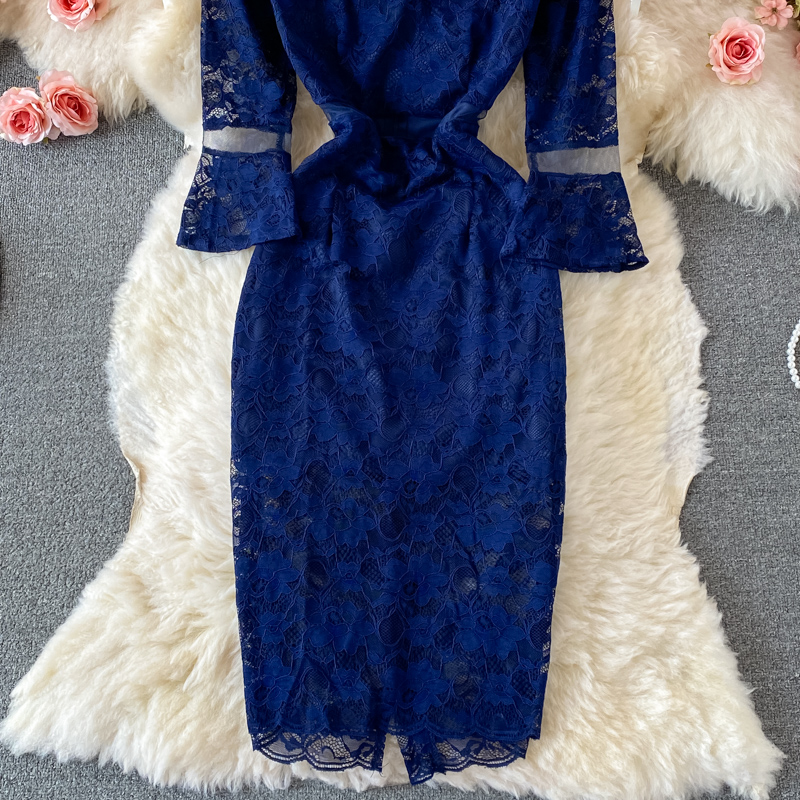 Cheap Dresses, Buy Quality Women’s Clothing Directly from China Suppliers:Summer Blue/Beige Hollow Out Lace Dress Women Vintage V Neck Flare Sleeve High Waist Bodycon Vestidos Lady Party Robe New