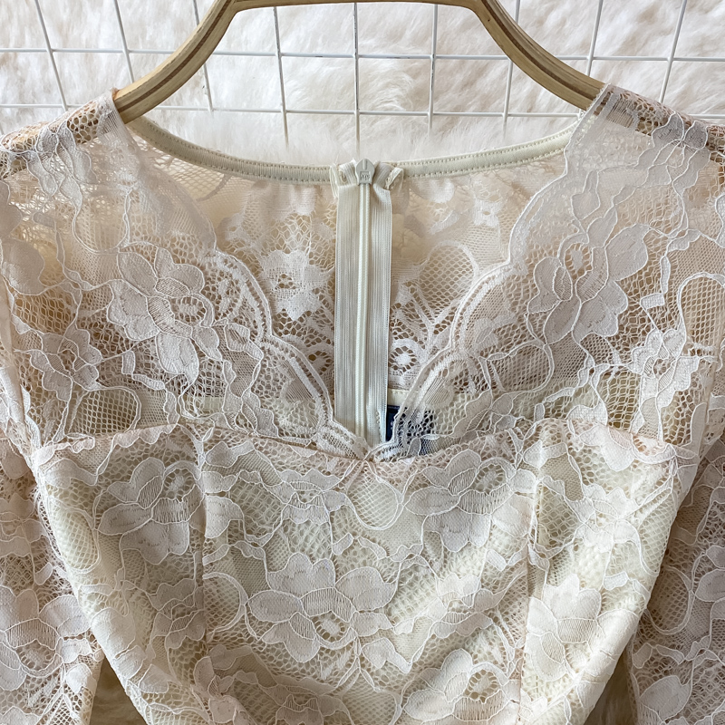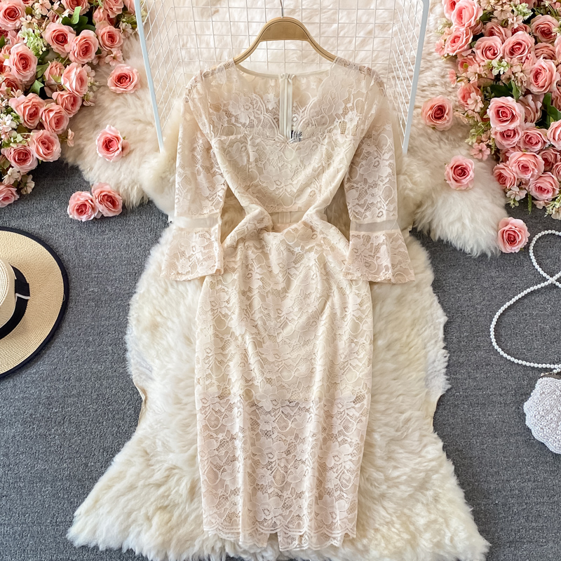 Summer Blue/Beige Hollow Out Lace Dress Women Vintage V-Neck Flare Sleeve High Waist Bodycon Vestidos Lady Party Robe New