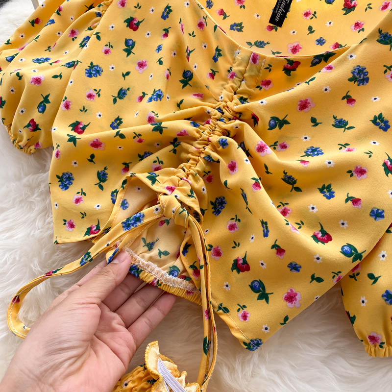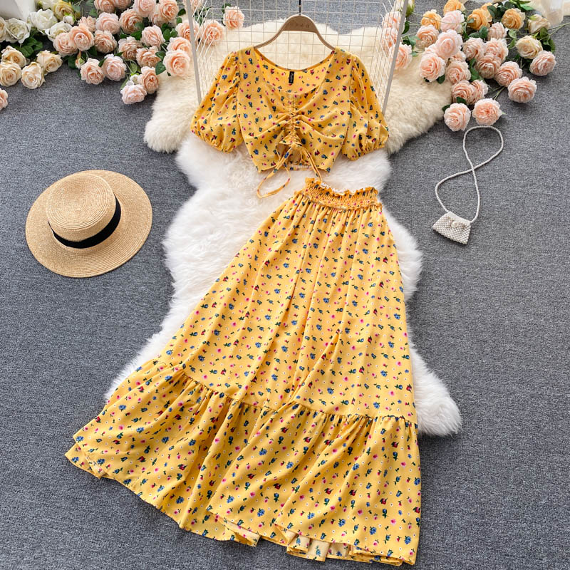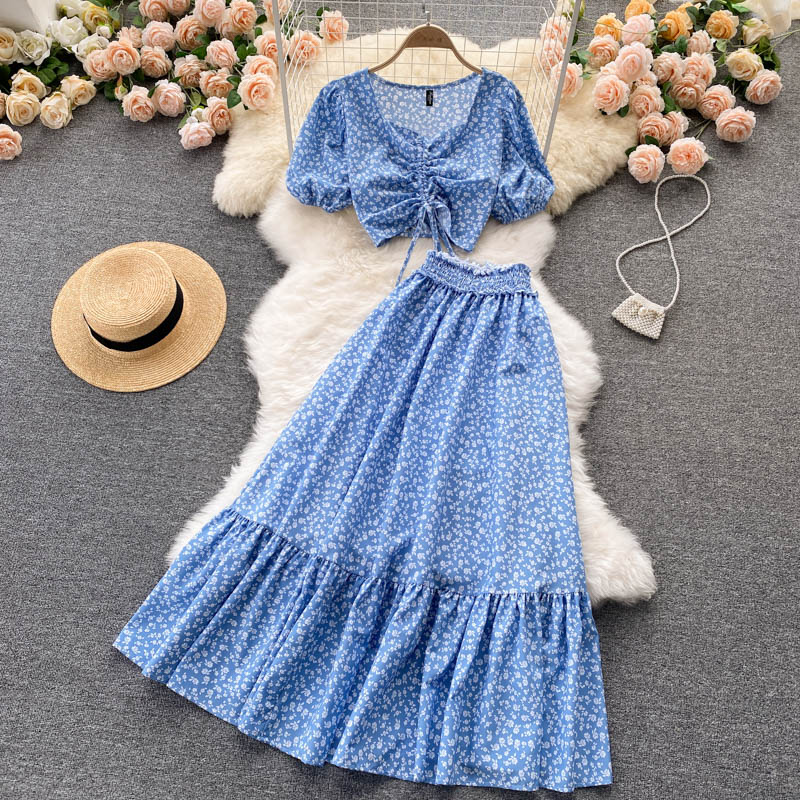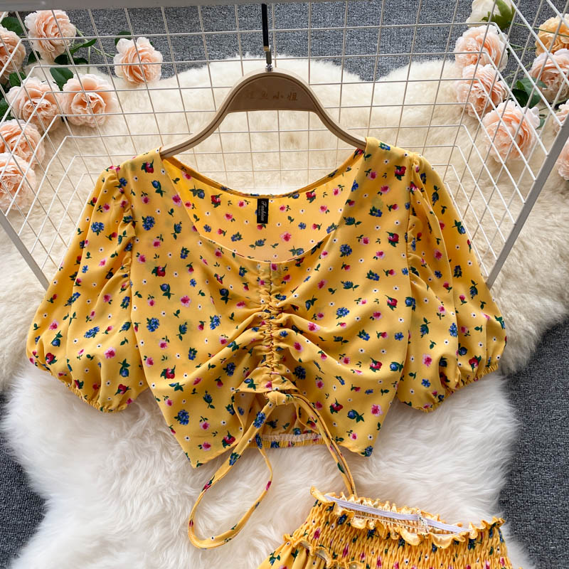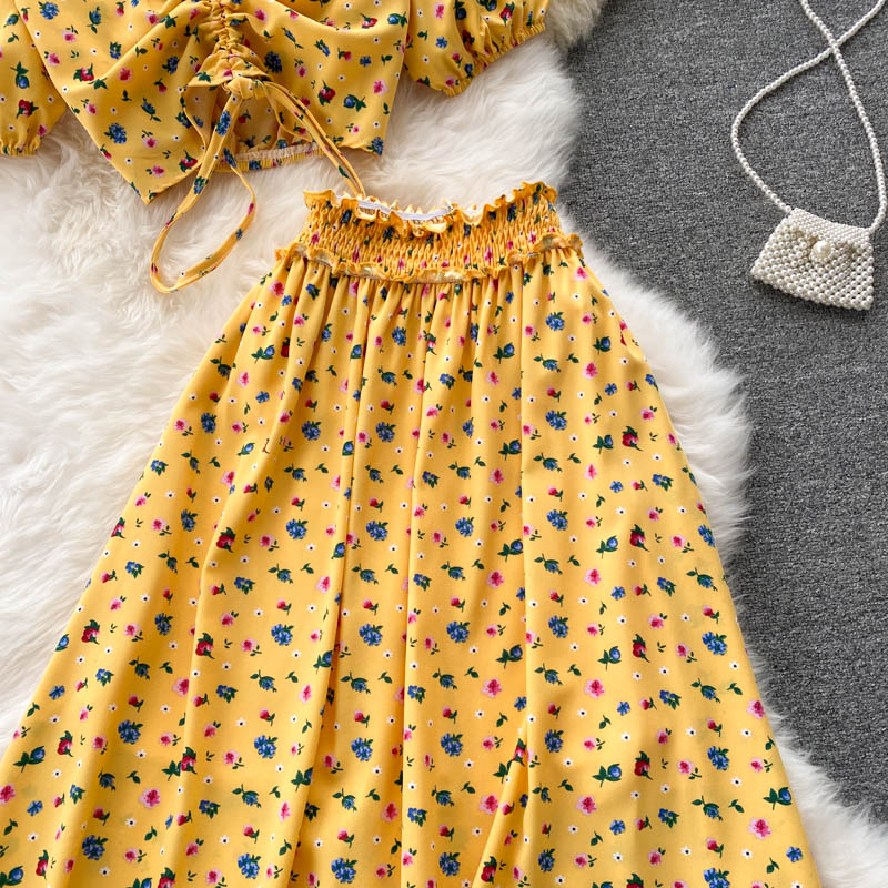 Women Printed 2Pcs Set Summer Vintage Square Collar Drawstring Short Tops + High Waist A-Line Long Skirt Female Two Piece Suit