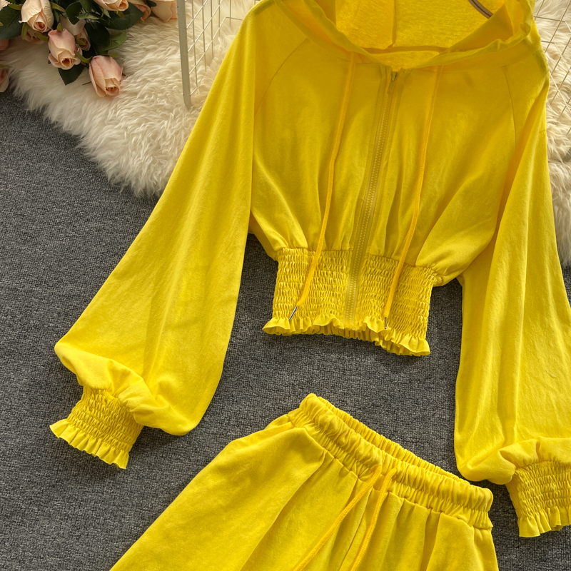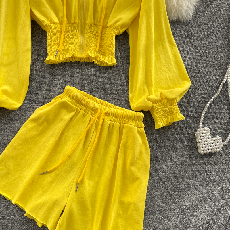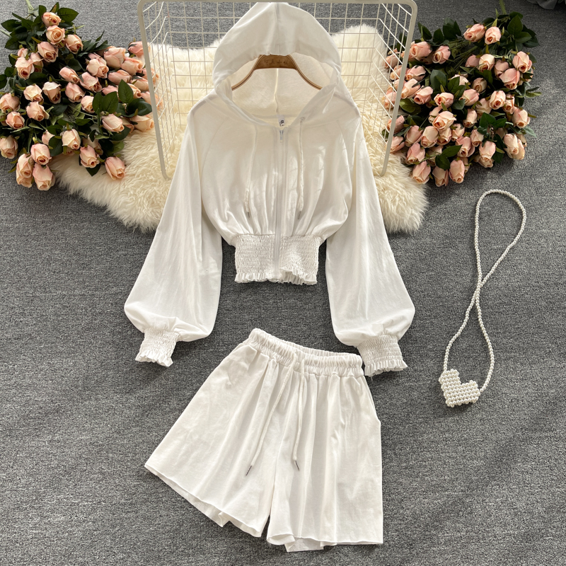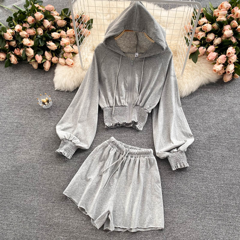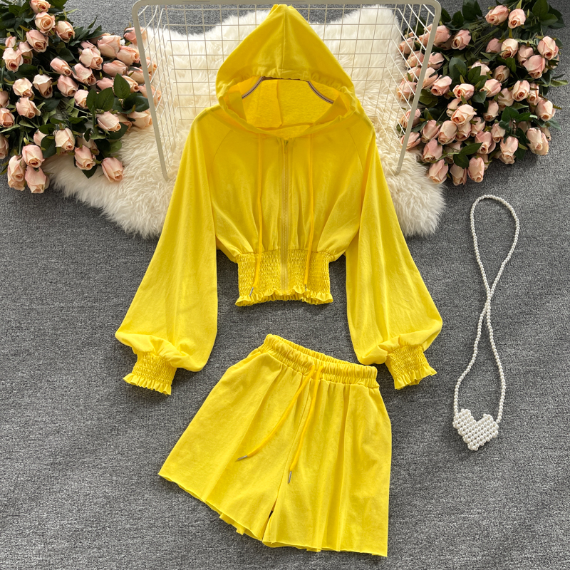 Women Yellow/White/Gray Sport 2Pcs Set Autumn Casual Hooded Cardigans Hoodies + High Waist Shorts Female Fashion Suits New