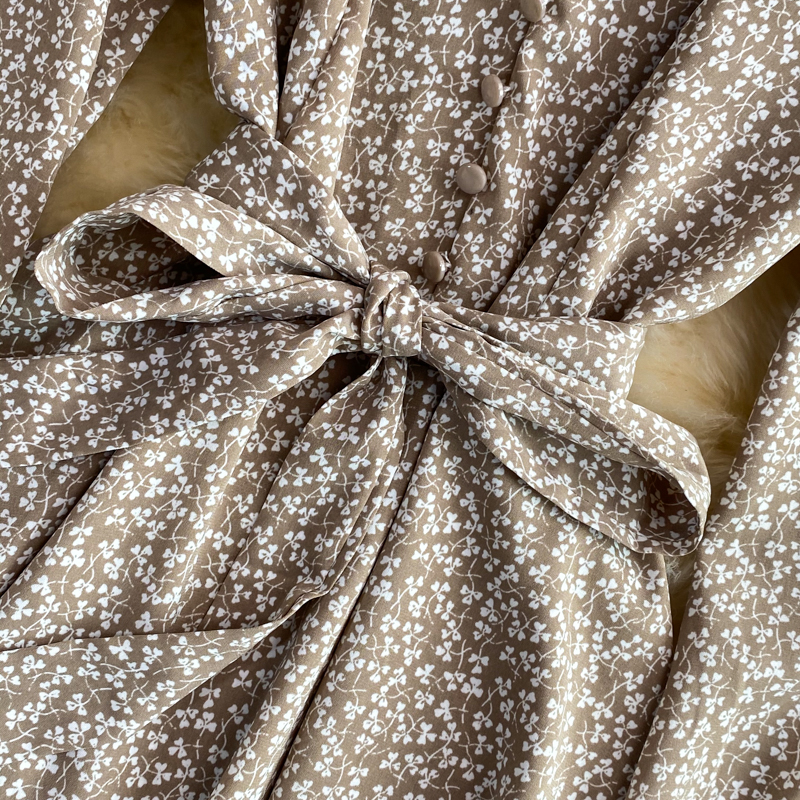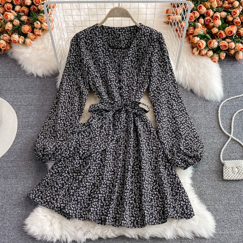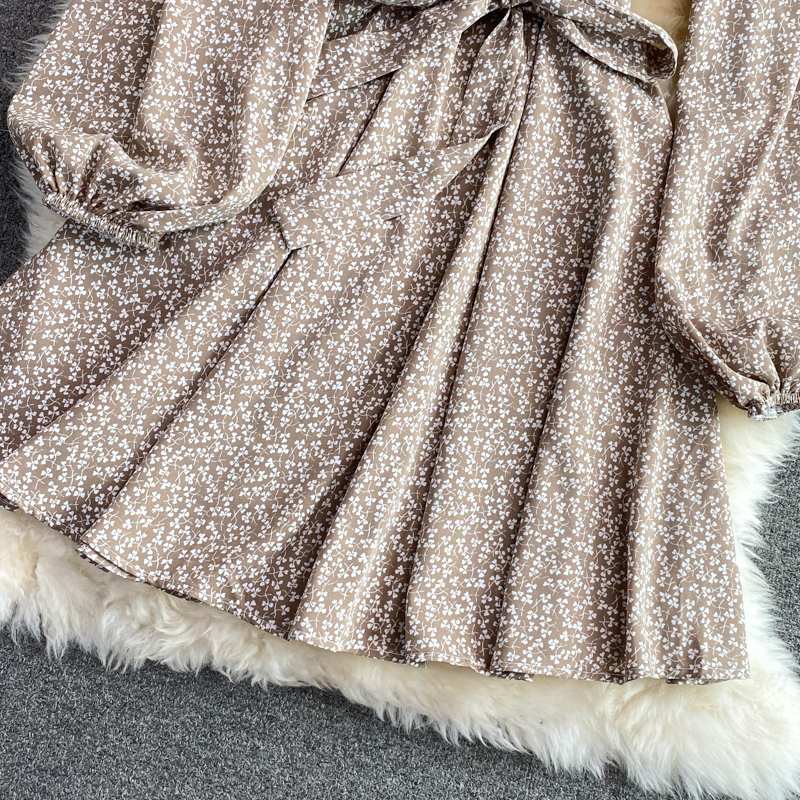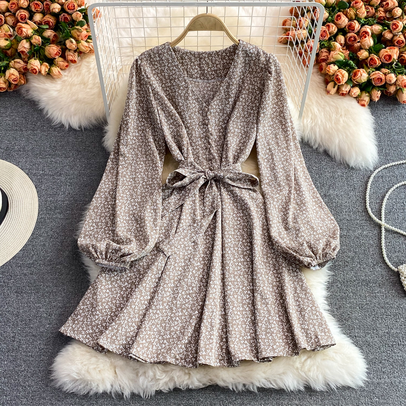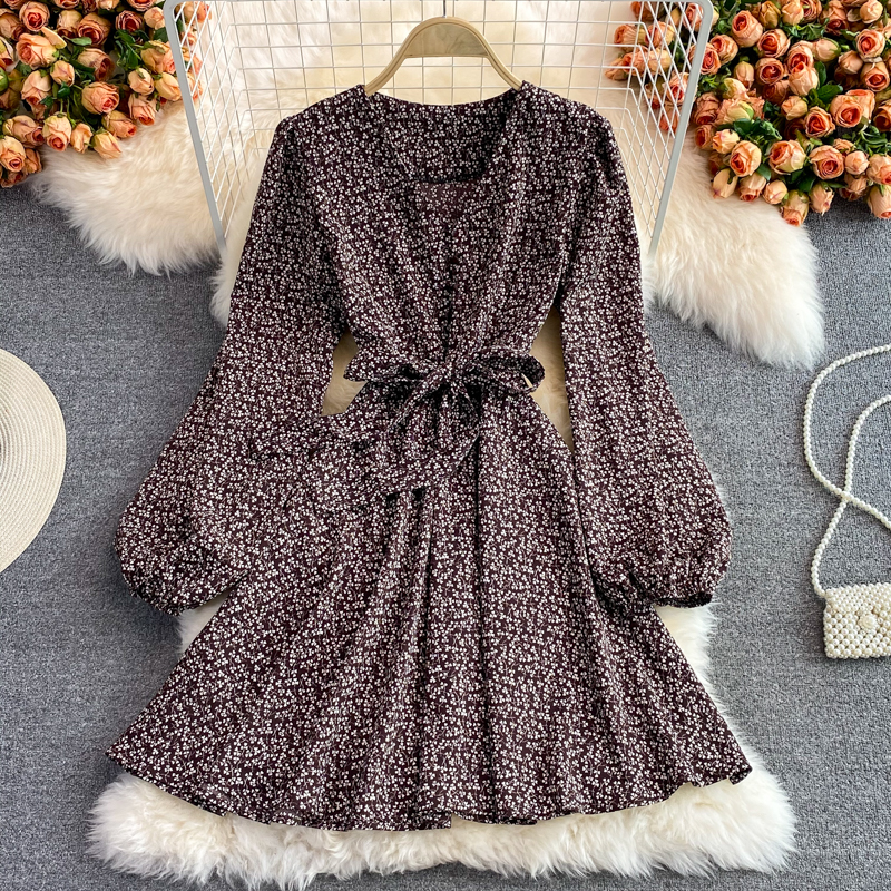 Autumn Vintage V-Neck Printed Chiffon Mini Dress Women Sexy V-Neck Long Sleeve High Waist Vestidos With Sashes Female New