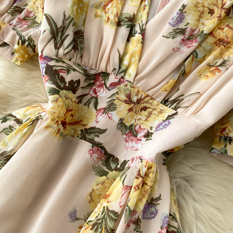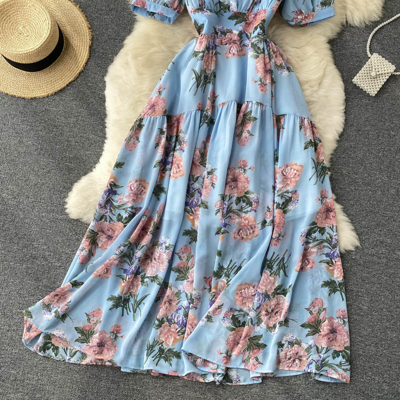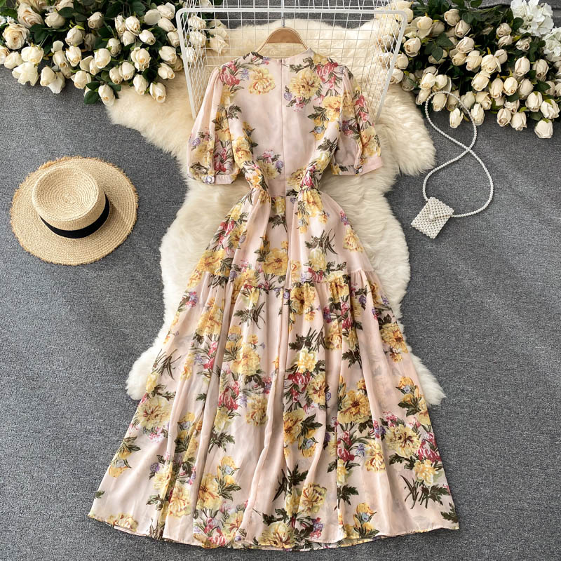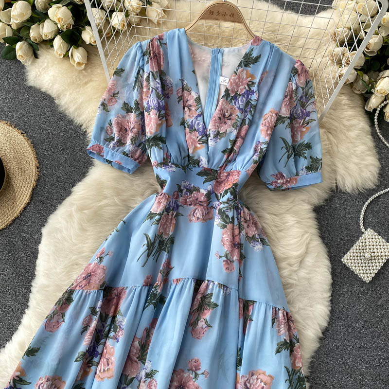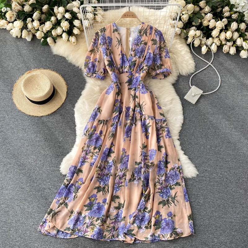 Cheap Dresses, Buy Quality Women’s Clothing Directly from China Suppliers:Summer Bohemian Floral Draped Midi Dress Sexy V Neck Short Puff Sleeve High Waist Chiffon Vestidos Female Vacation Beach Robe