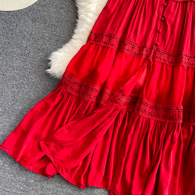 Summer Indie Folk Red Embroidered Midi Dress Sexy V-Neck Sleeveless Hollow Out Beach Vestidos Casual A-Line Robe Fashion