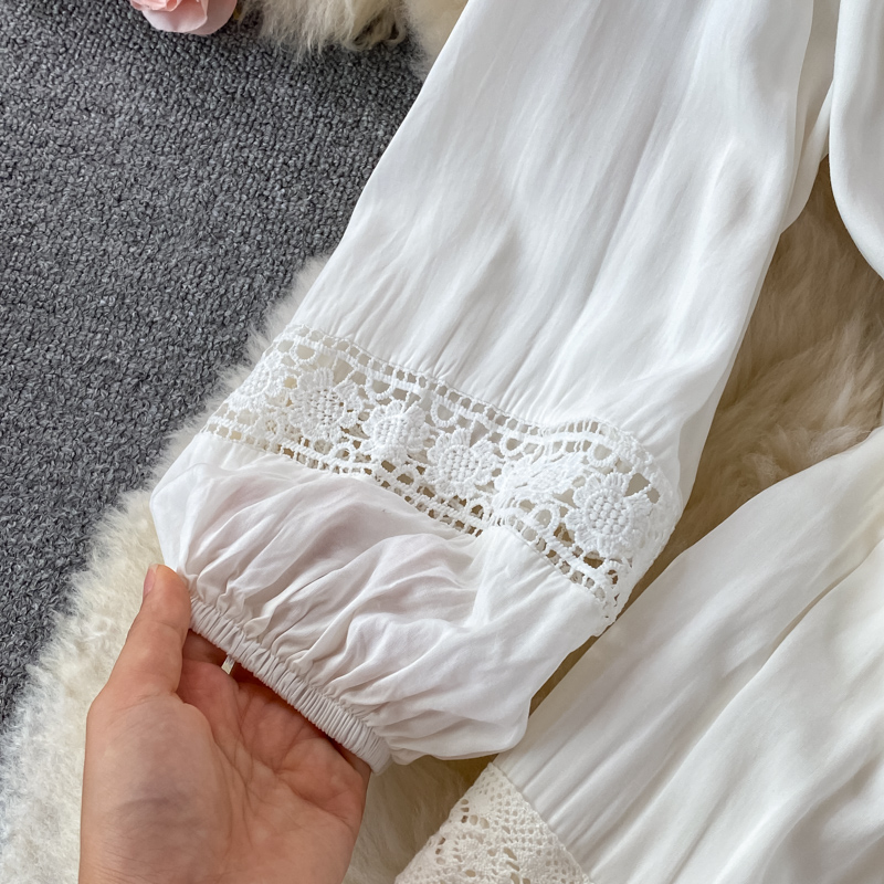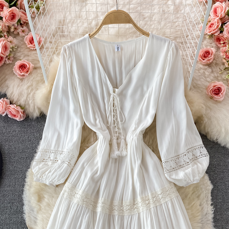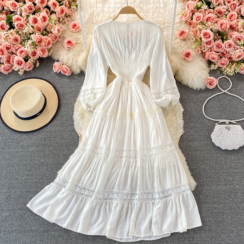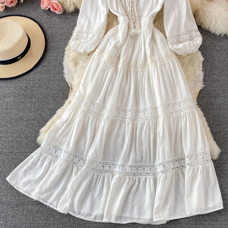 Autumn Sexy Hollow Out Beach Long Dress For Women White V-Neck Puff Sleeve Bandage Maxi Vestidos Elegant Club Party Robe