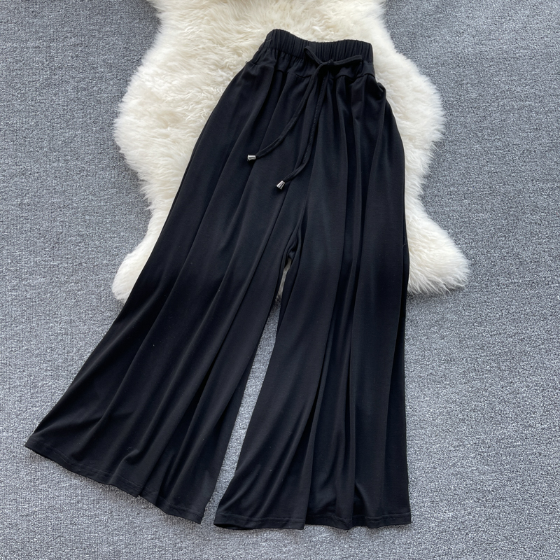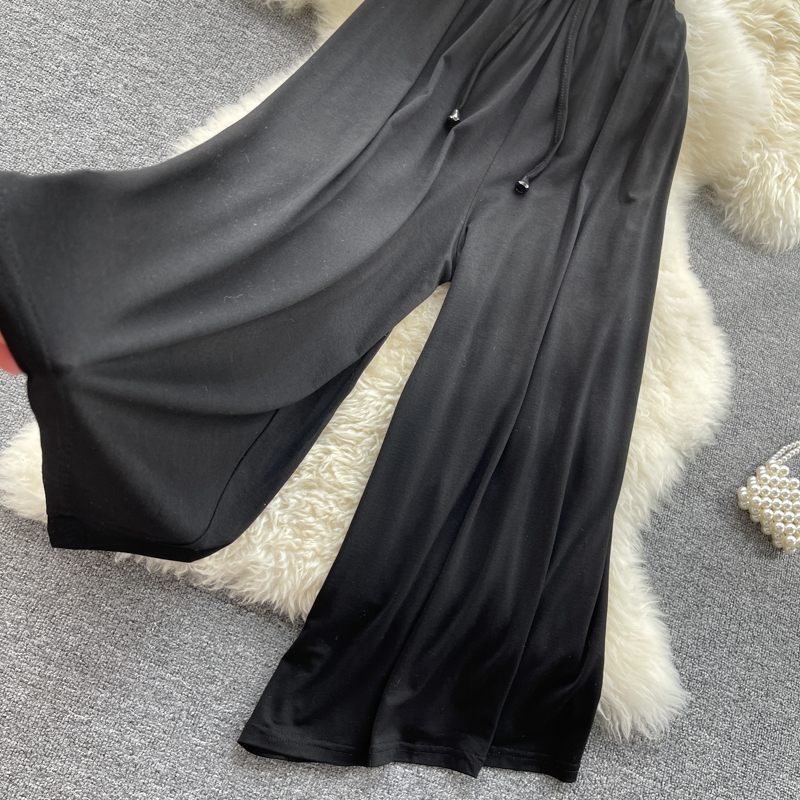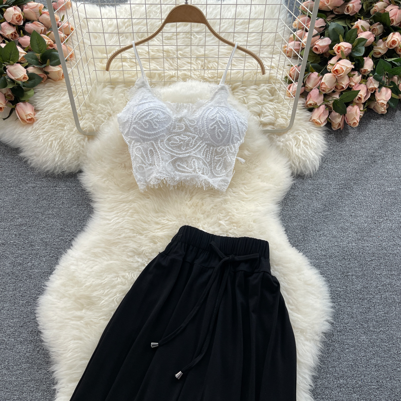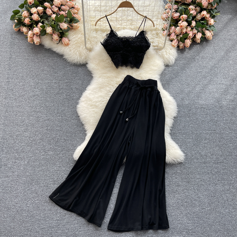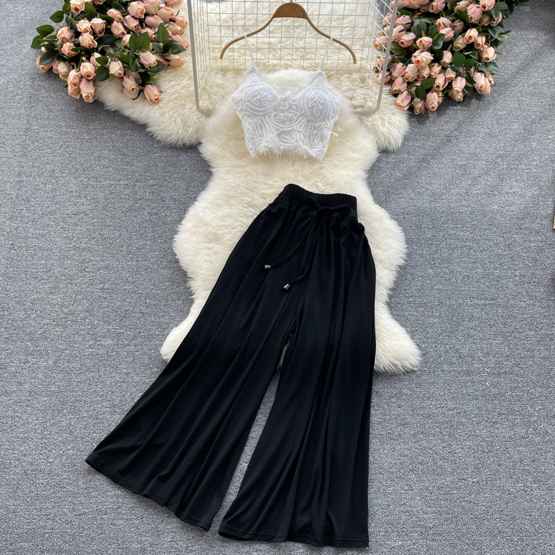 Summer Sexy Black/White Lace Two Piece Set For Women Sleeveless Camis + High Elastic Waist Wide Leg Pleated Pants Female Suits