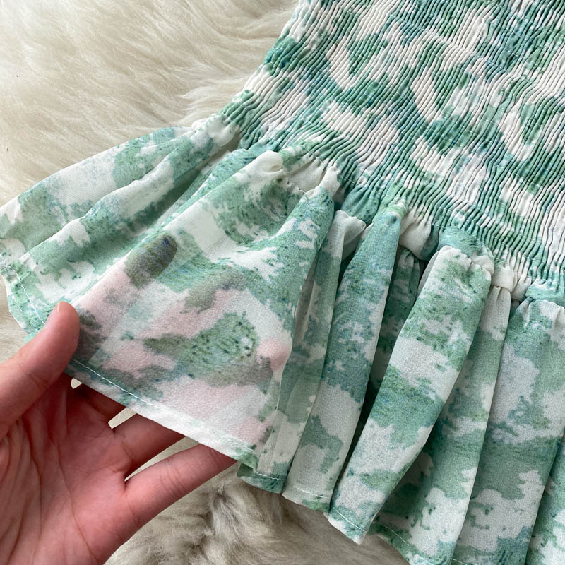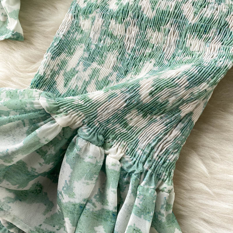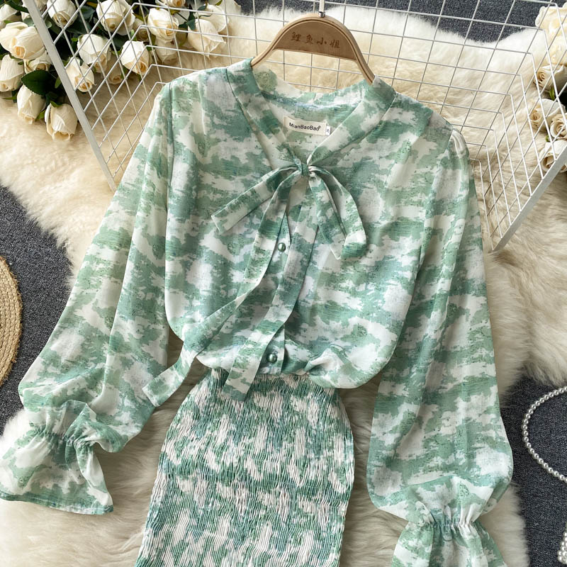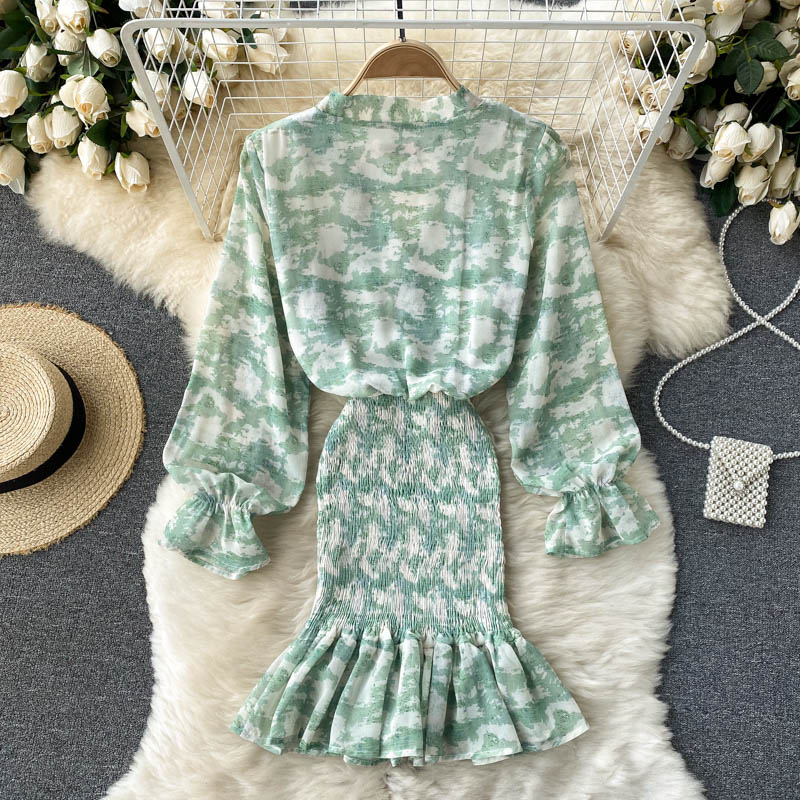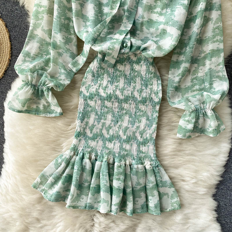 Autumn Green Printed Chiffon Bodycon Dress Women Elegant Bow Collar Flare Long Sleeve High Waist Draped Vestidos Mermaid Robe