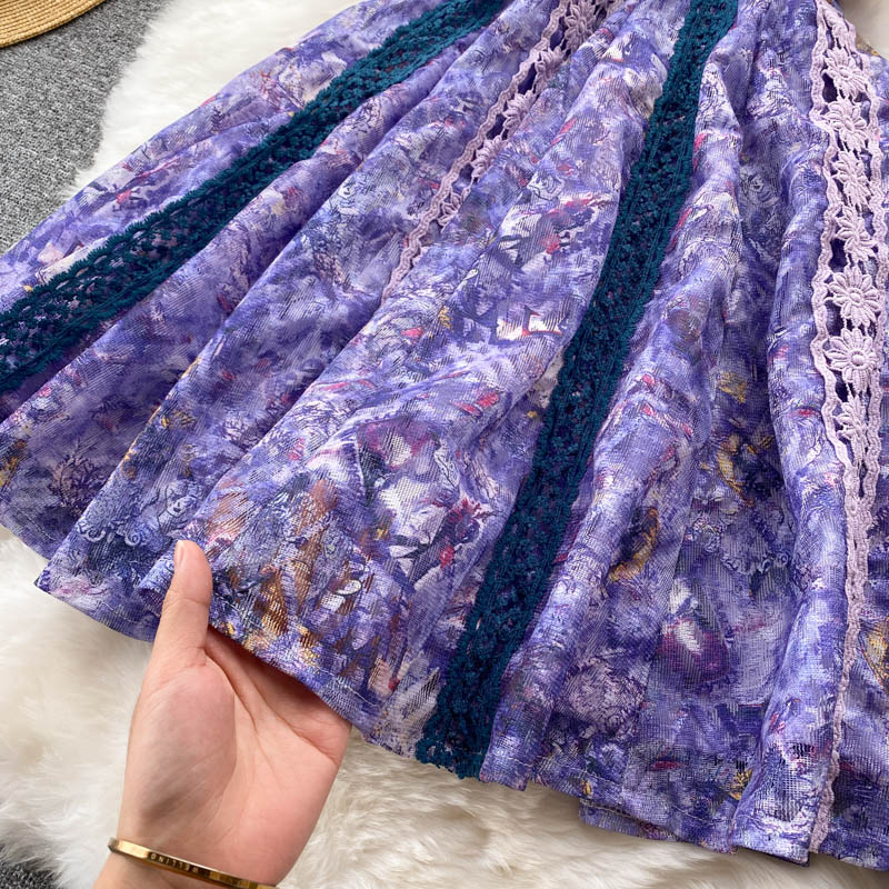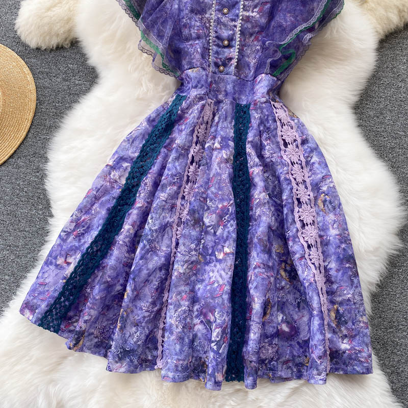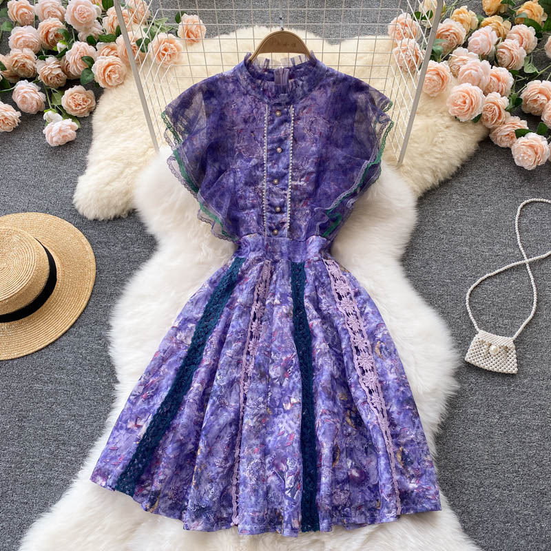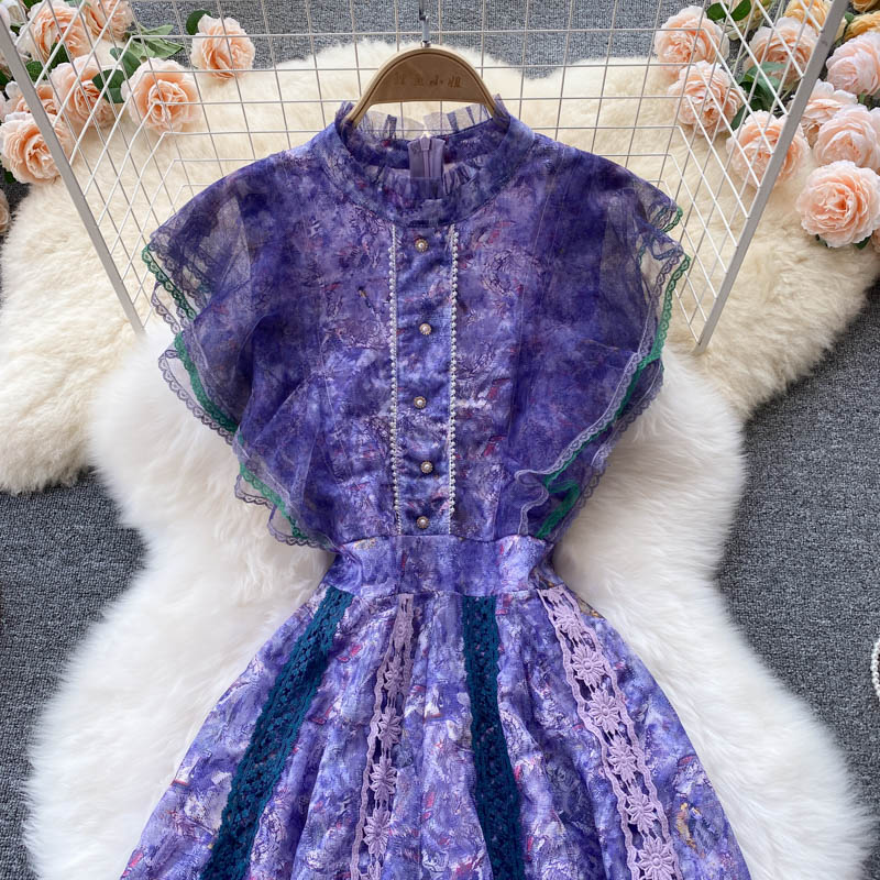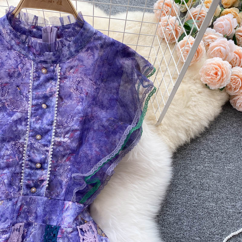 Women Purple Printed Mesh Patchwork Mini Dress Vintage Flying Sleeve High Waist Embroidered Vestidos Elegant Party Robe New