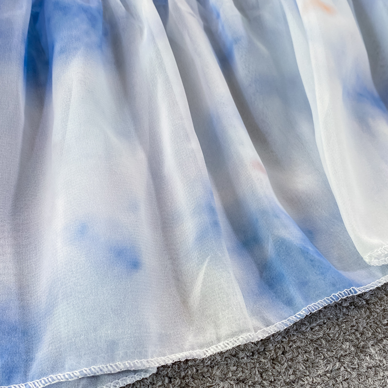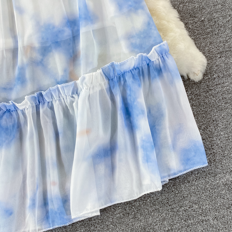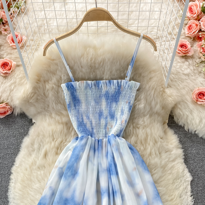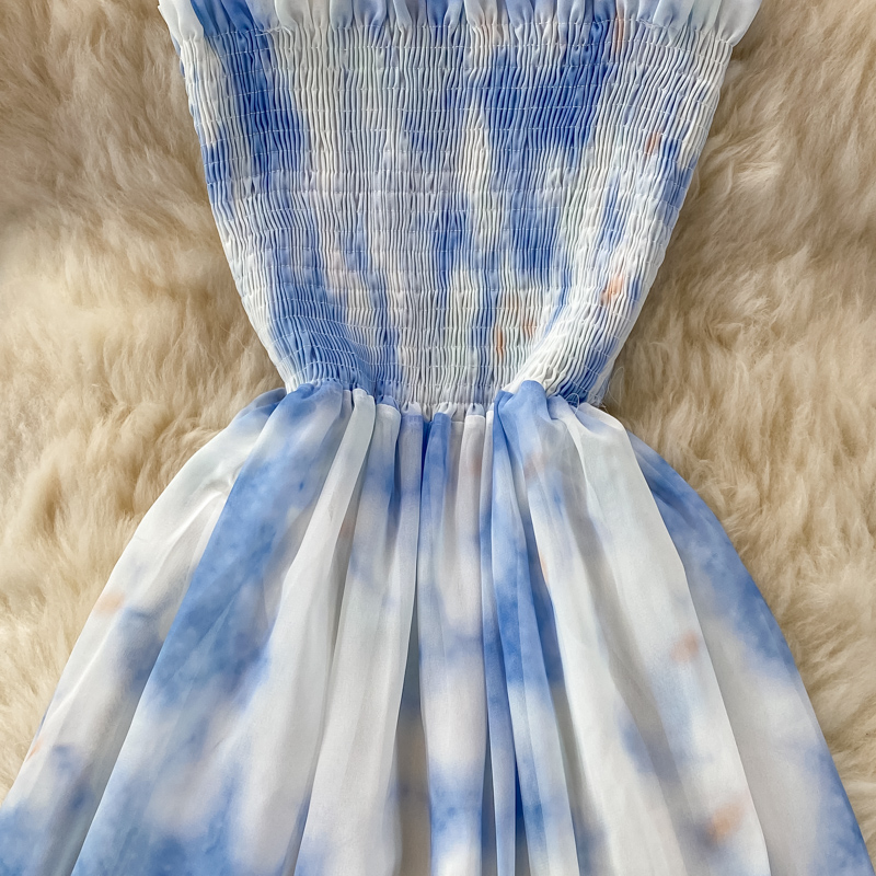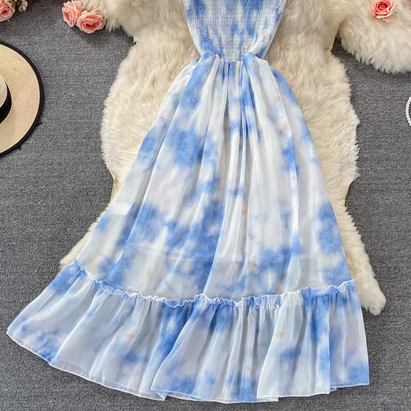 Sweet Blue Dye Tie Spaghetti Strap Dress For Women Sexy Slash Neck Sleeveless High Waist A-Line Ruffle Midi Vestidos New