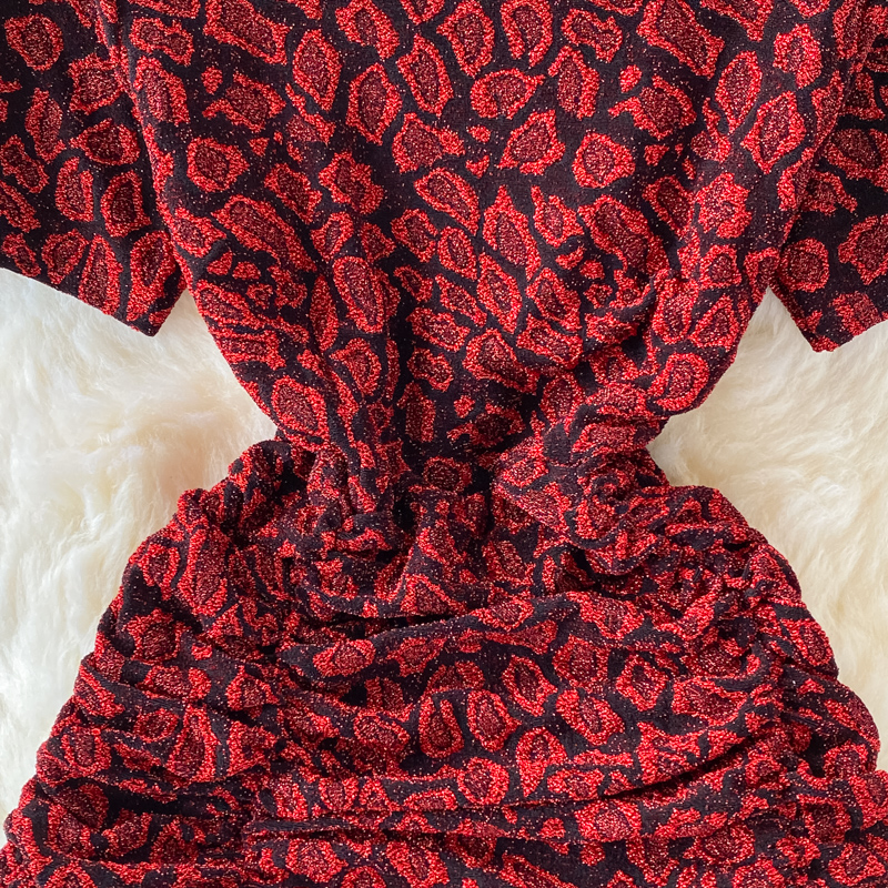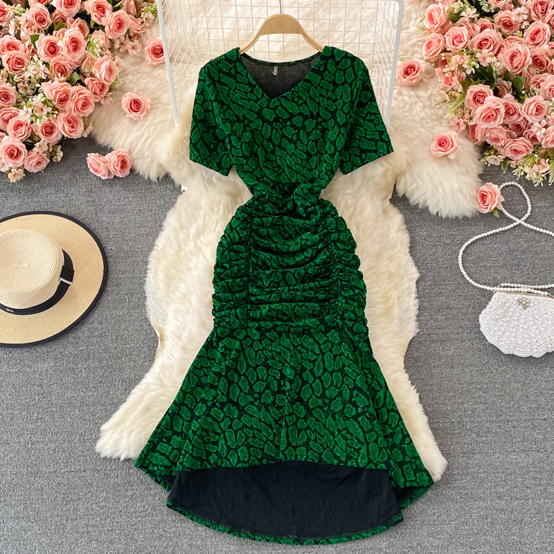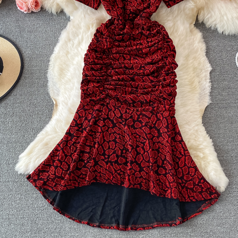 Summer Women Leopard Draped Midi Dress Sexy V-Neck Short Sleeve High Waist Mermaid Bodycon Vestidos Elegant Party Robe New
