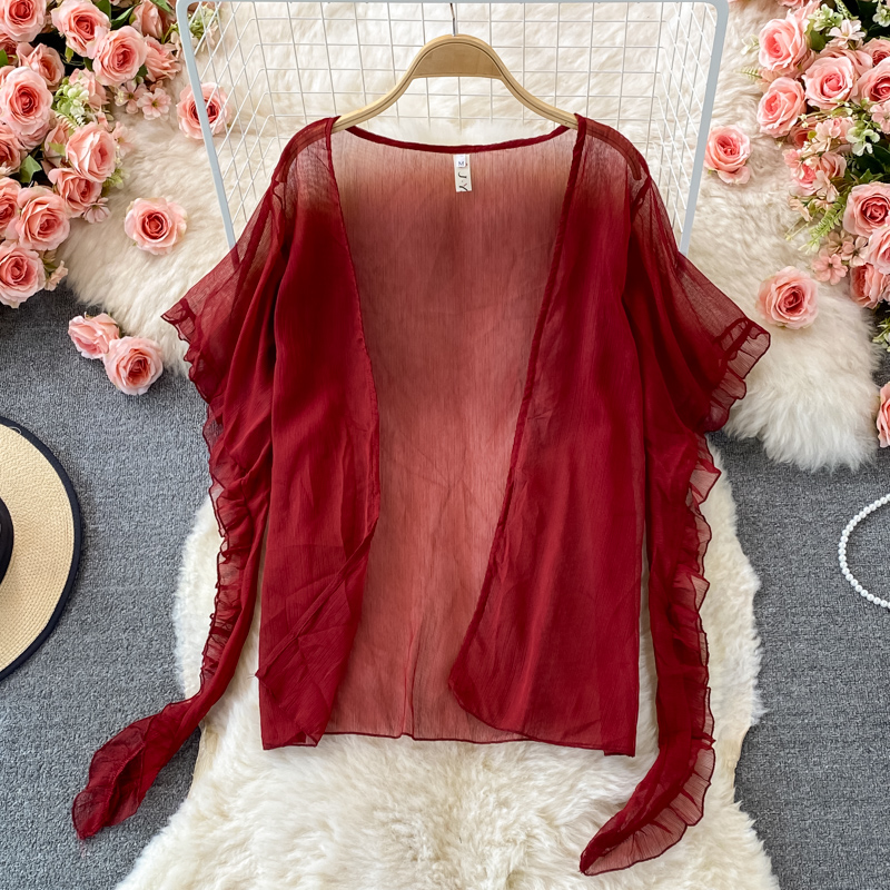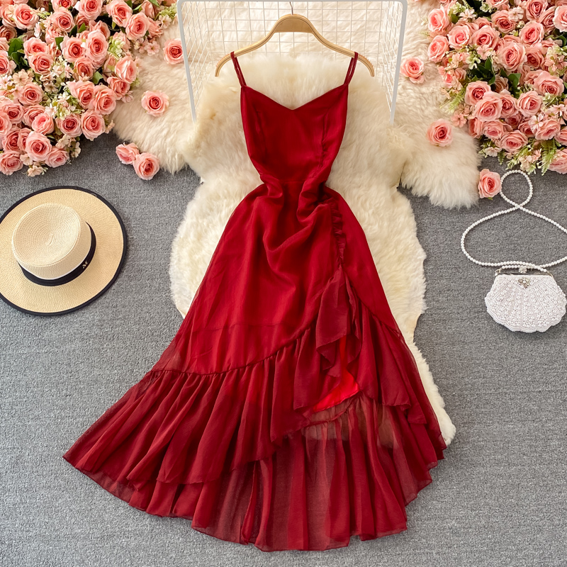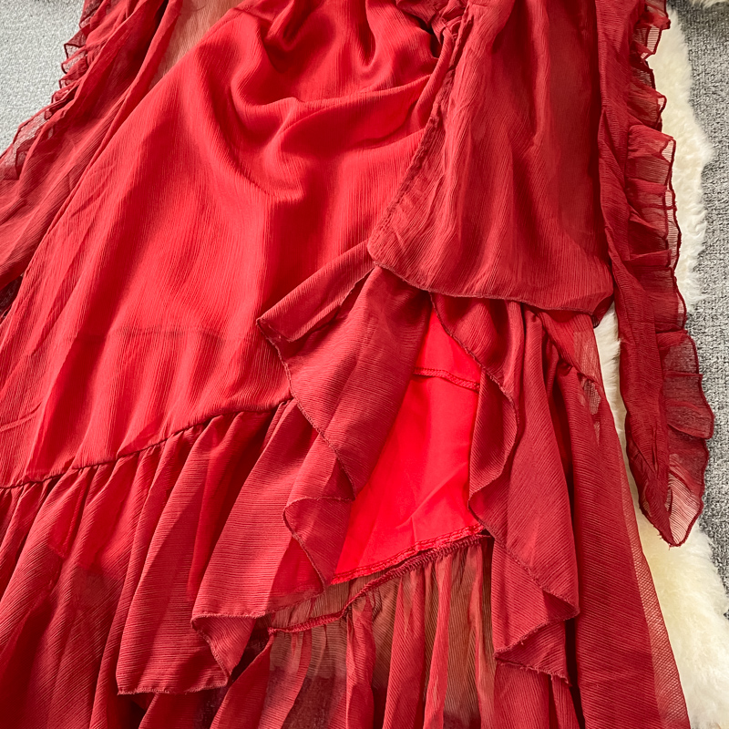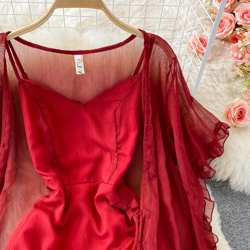 Sexy Red Irregular Chiffon Midi Dress Women Elegant Vacation Beach Party Spaghetti Strap Vestidos With Shawl Summer Ruffle Robe