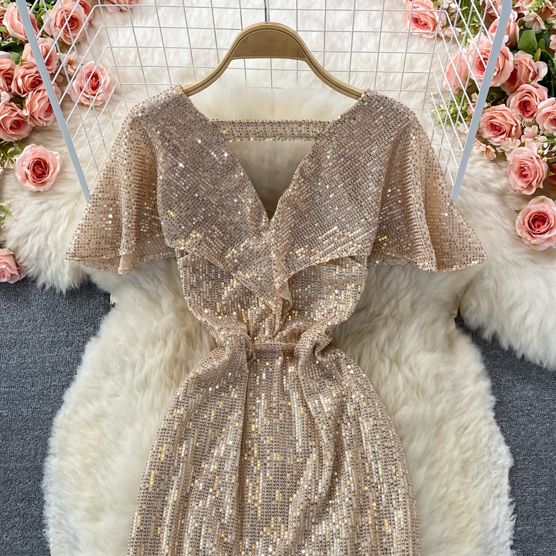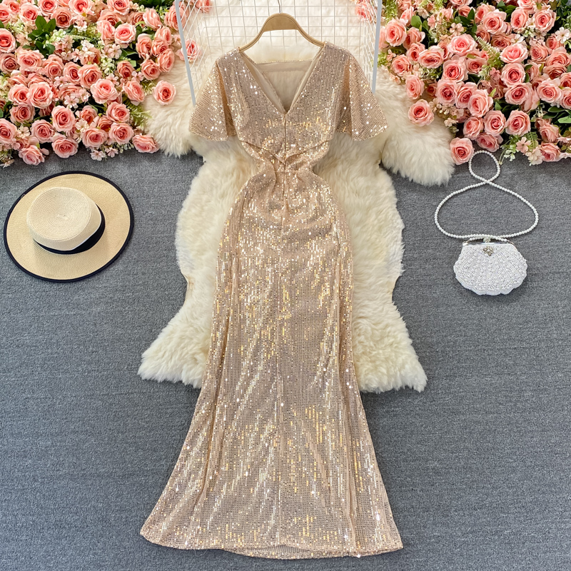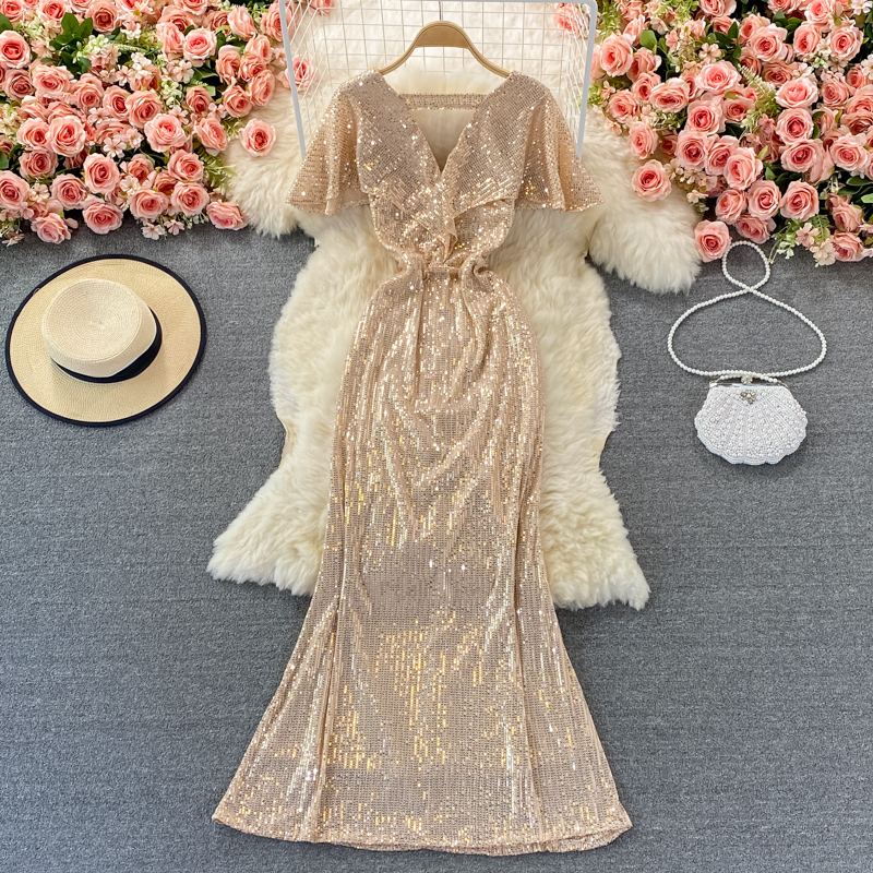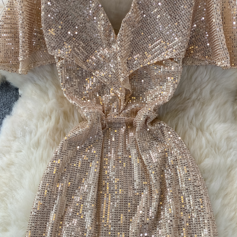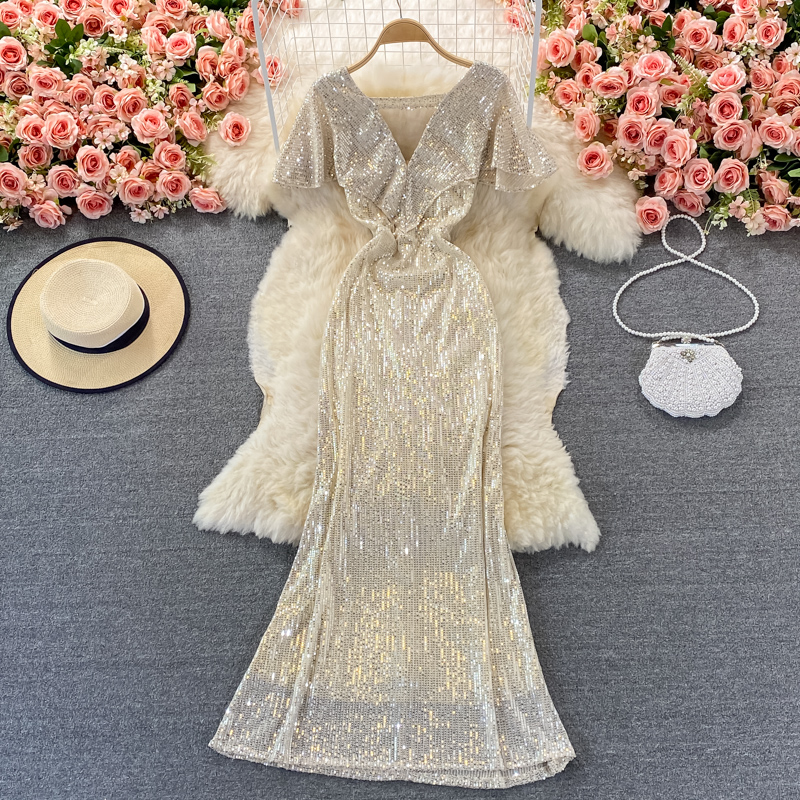 Sexy Sequins Mermaid Party Long Dress Women Elegant V-Neck Short Sleeve Ruffle High Waist Vestidos Summer Female Fashion