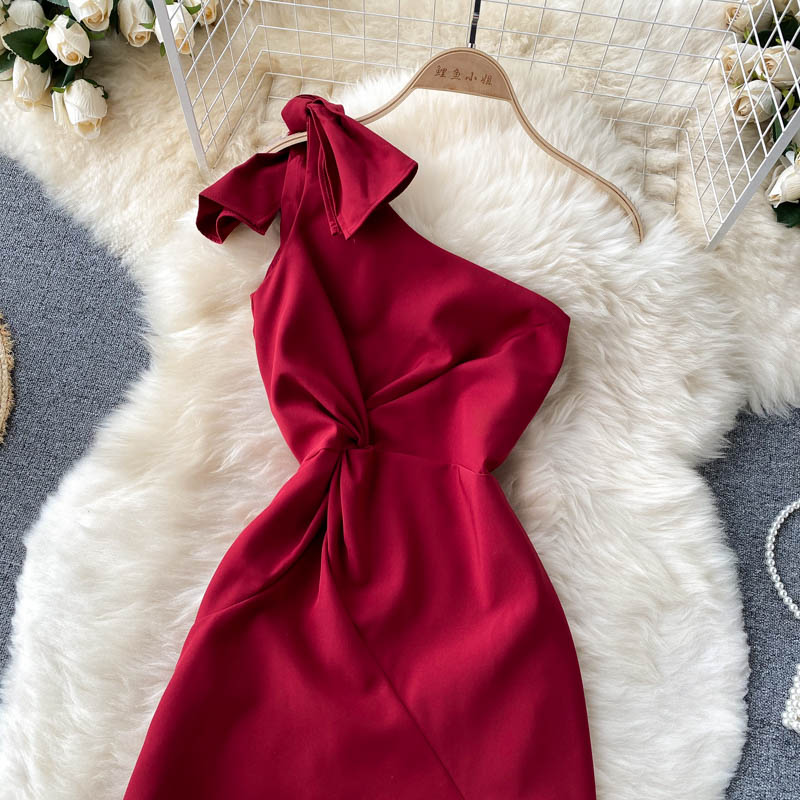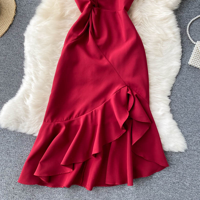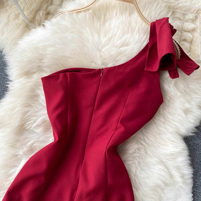 Summer Women Sexy Red Irregular Party Dress Elegant Diagonal Collar Ruffle Spaghetti Strap Robe Female High Waist Vestidos