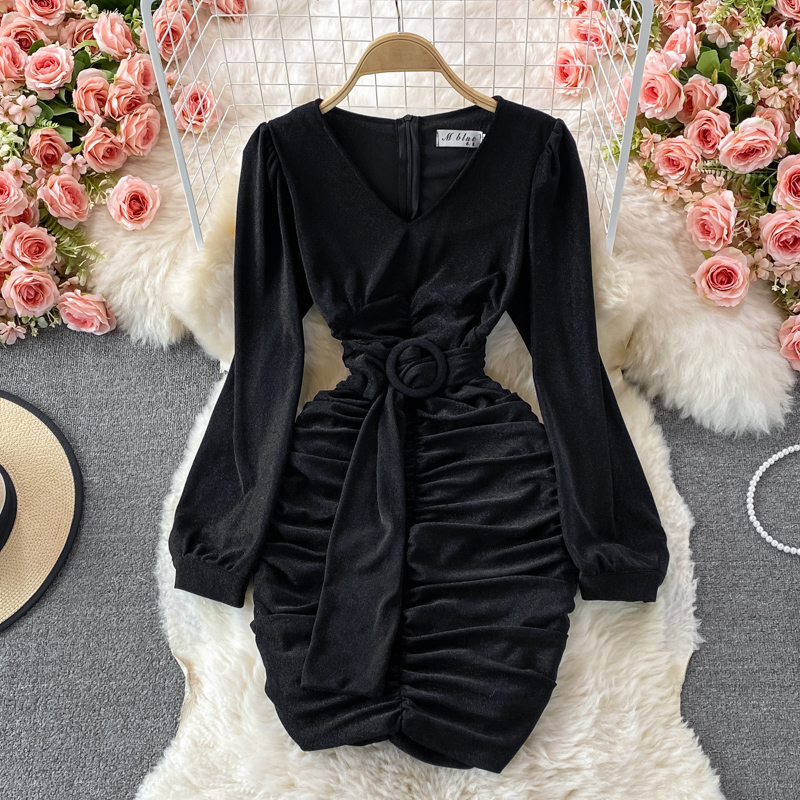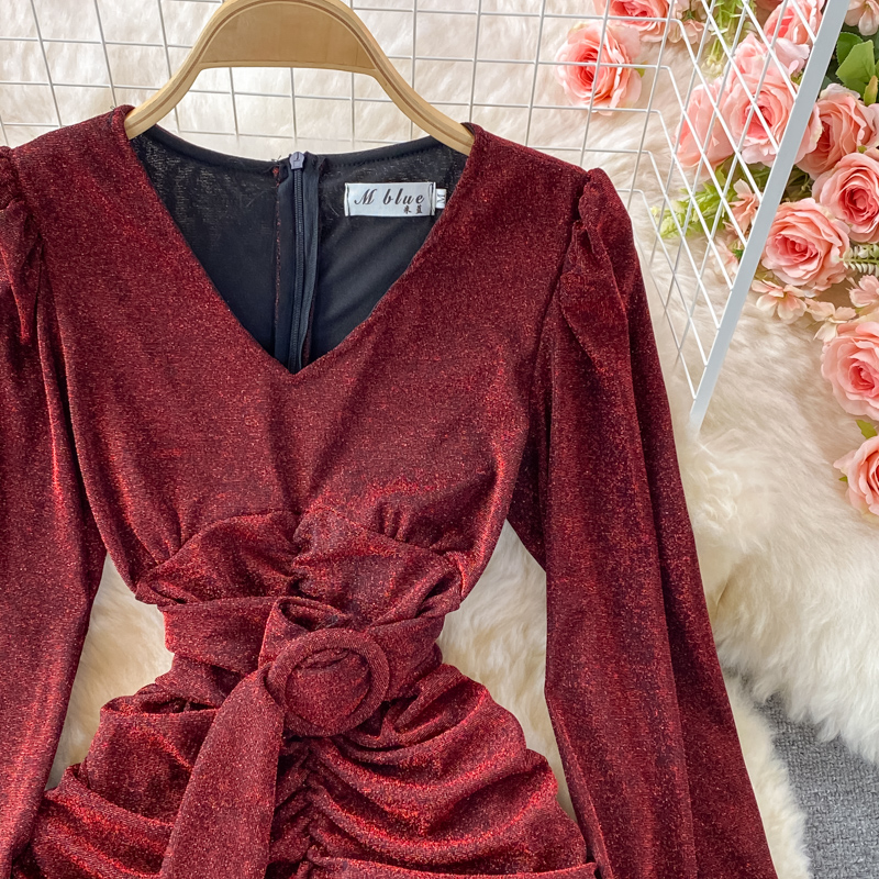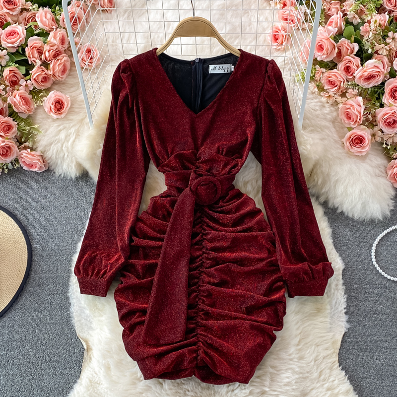 Cheap Dresses, Buy Quality Women’s Clothing Directly from China Suppliers:Autumn Red/Brown/Black Draped Bodycon Dress Women Sexy V Neck Puff Long Sleeve High Waist Party Vestidos Female New Fashion