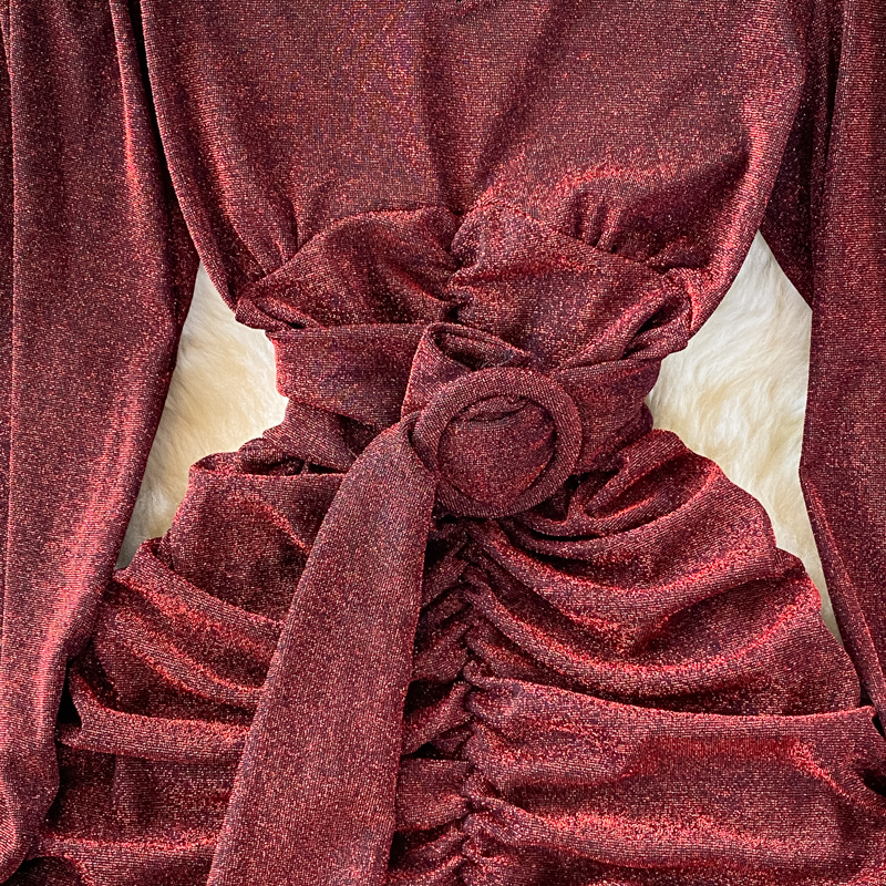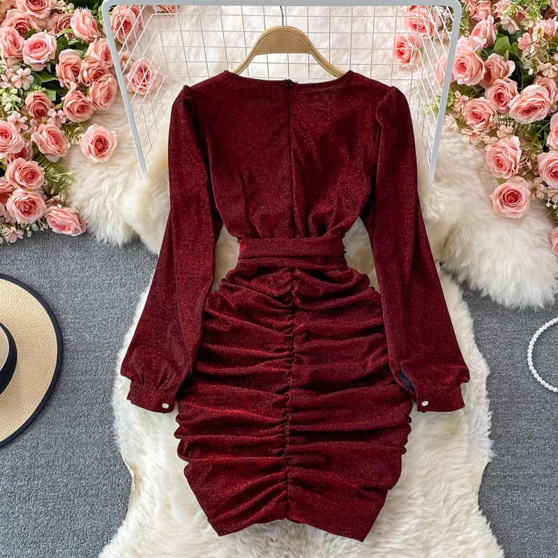 Autumn Red/Brown/Black Draped Bodycon Dress Women Sexy V-Neck Puff Long Sleeve High Waist Party Vestidos Female New Fashion