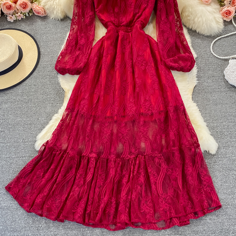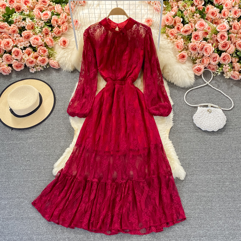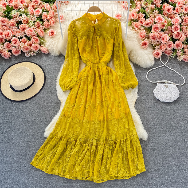 Cheap Dresses, Buy Quality Women’s Clothing Directly from China Suppliers:Autumn Red/Green/Yellow Lace Long Dress For Women Vintage Stand Collar Puff Sleeve High Waist A Line Party Maxi Vestidos