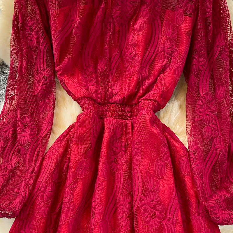 Women Hollow Out Lace Mini Dress Vintage Round Neck Short Sleeve High Waist A-Line Ruffle Party Vestidos Female Robe New