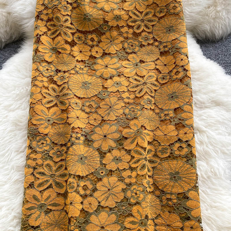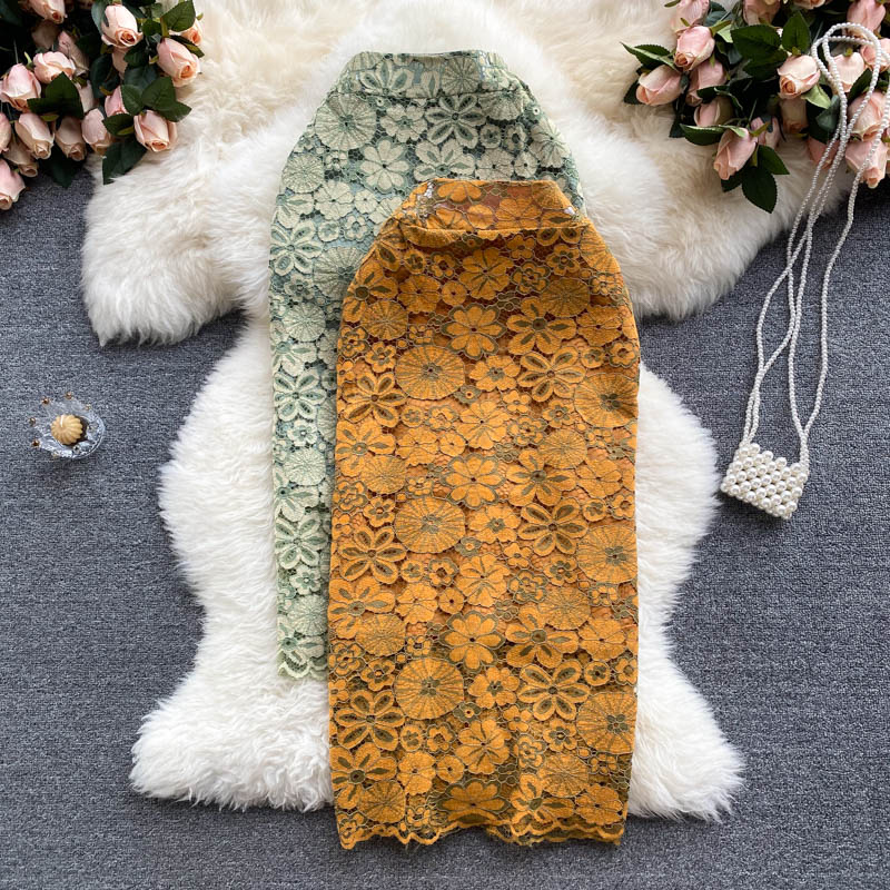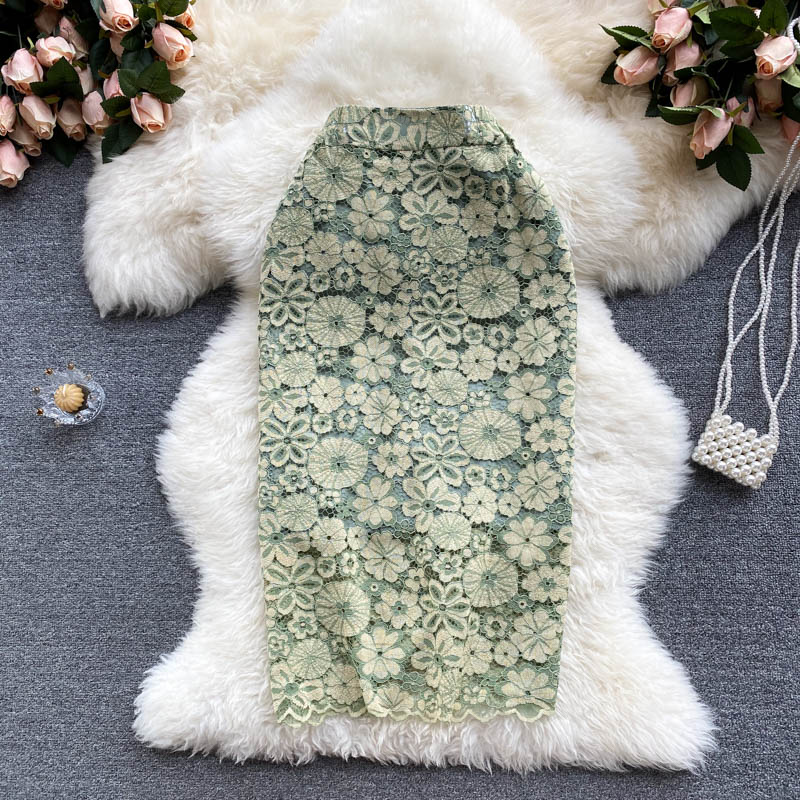 Women Yellow/Green Lace Embroidered Skirt Autumn Vintage High Waist Pencil Faldas Female Flower Sexy Skrits Saias New Fashion