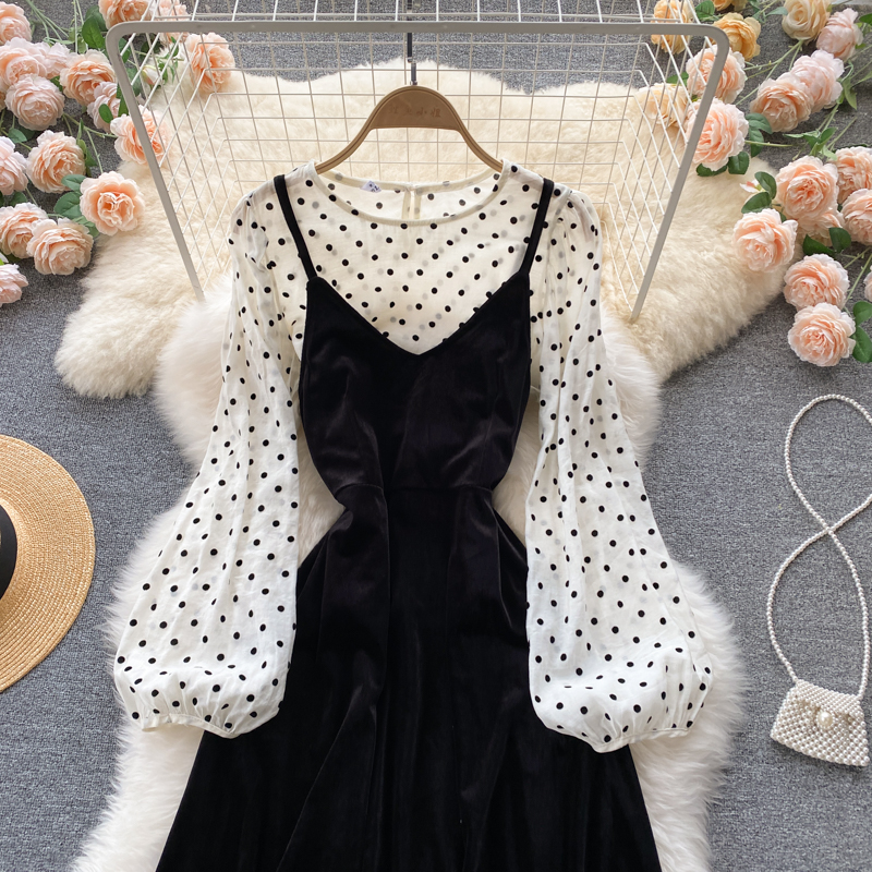 Autumn Women Two Piece Set Vintage Beige Polka Dot Blouse + Sexy V-Neck Spaghetti Strap Velvet Midi Dress Casual Sweet Suit