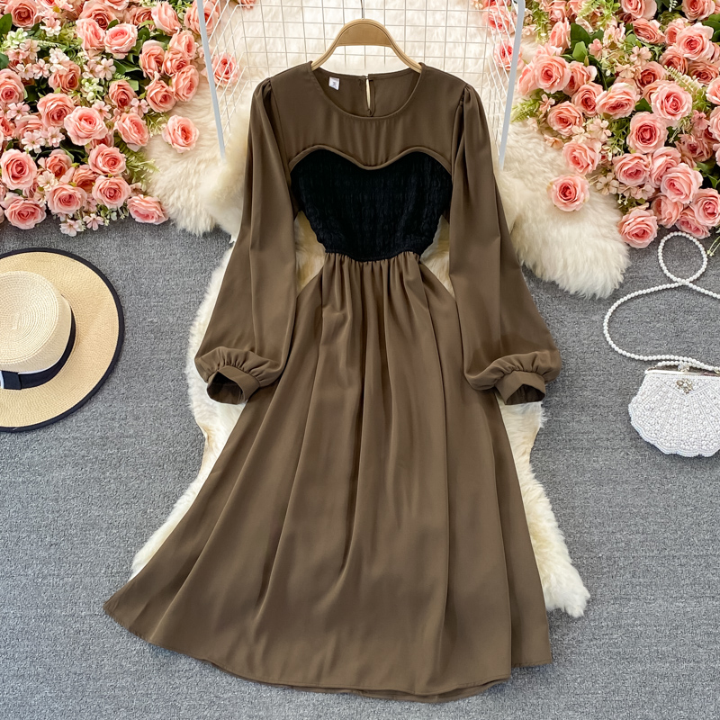 Cheap Dresses, Buy Quality Women’s Clothing Directly from China Suppliers:Autumn Brown/Beige/Black Patchwork Midi Dress Women Vintage Puff Long Sleeve High Waist A Line Party Vestidos Casual Robe