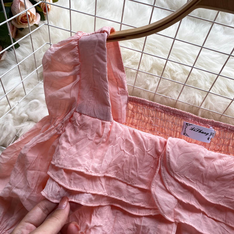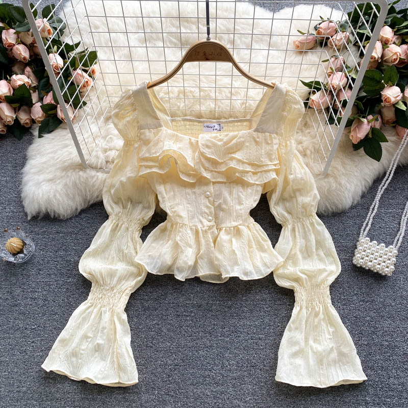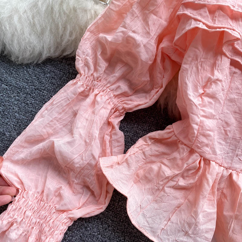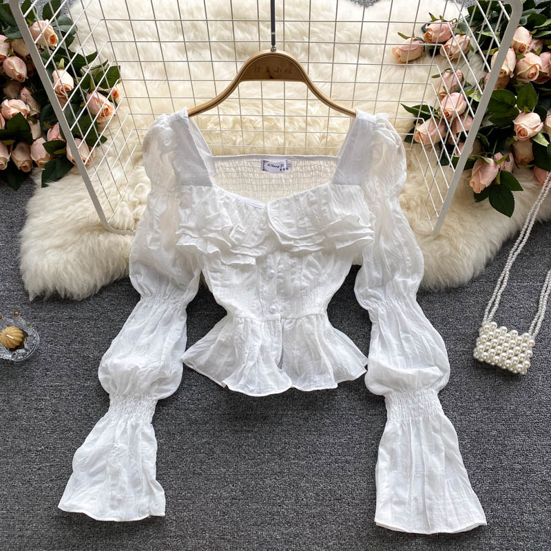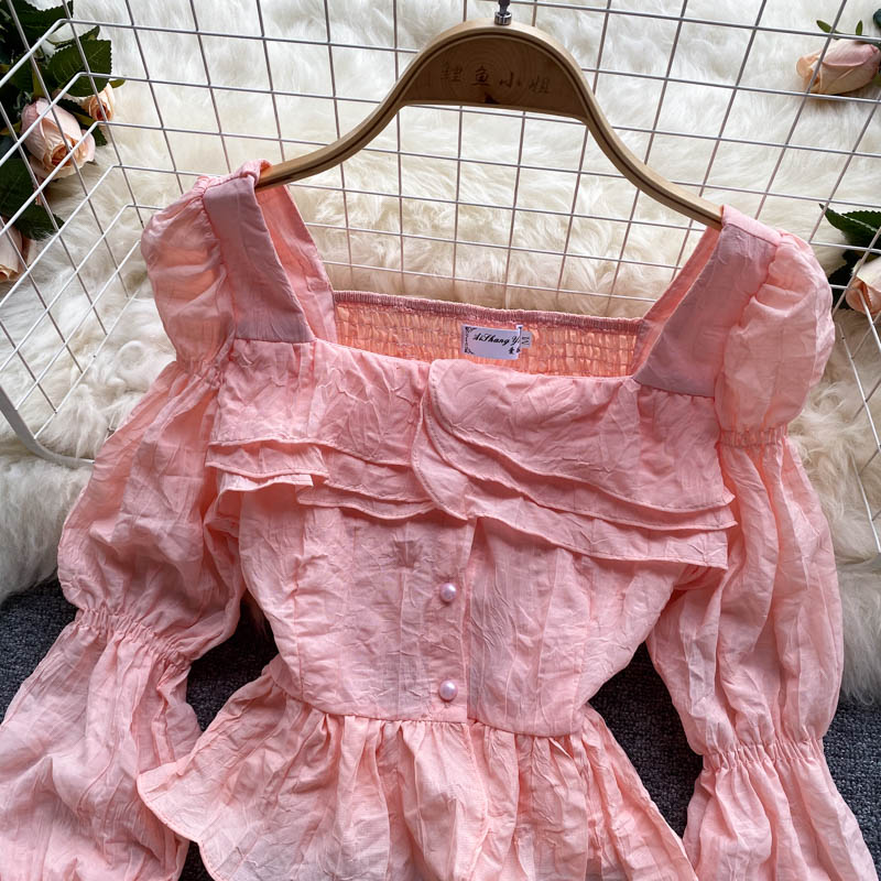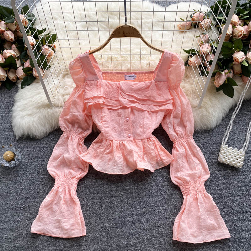 Autumn Sweet Pink/White Square Collar Flare Long Sleeve Short Blouse Women Casual Ruffle Party Shirt Female Elegant Blusas New