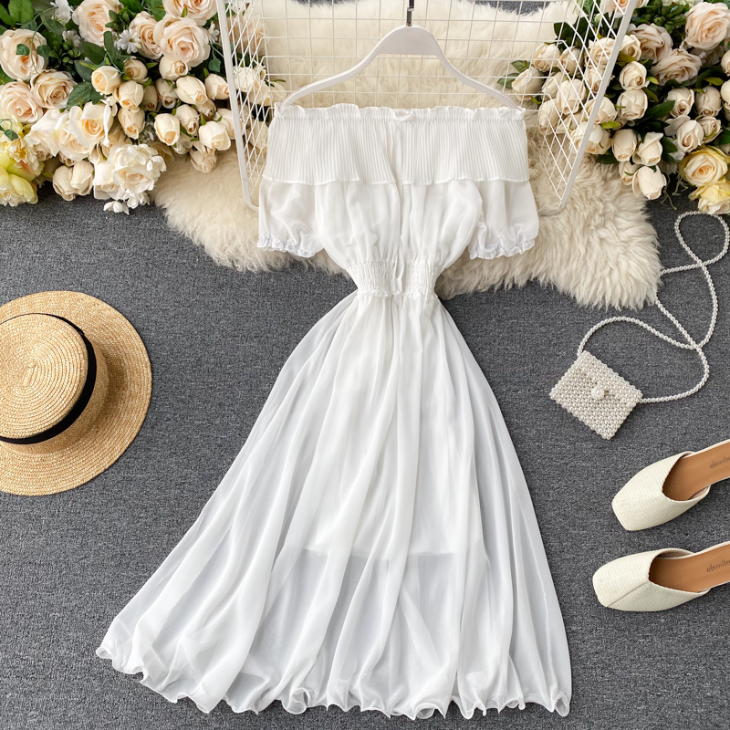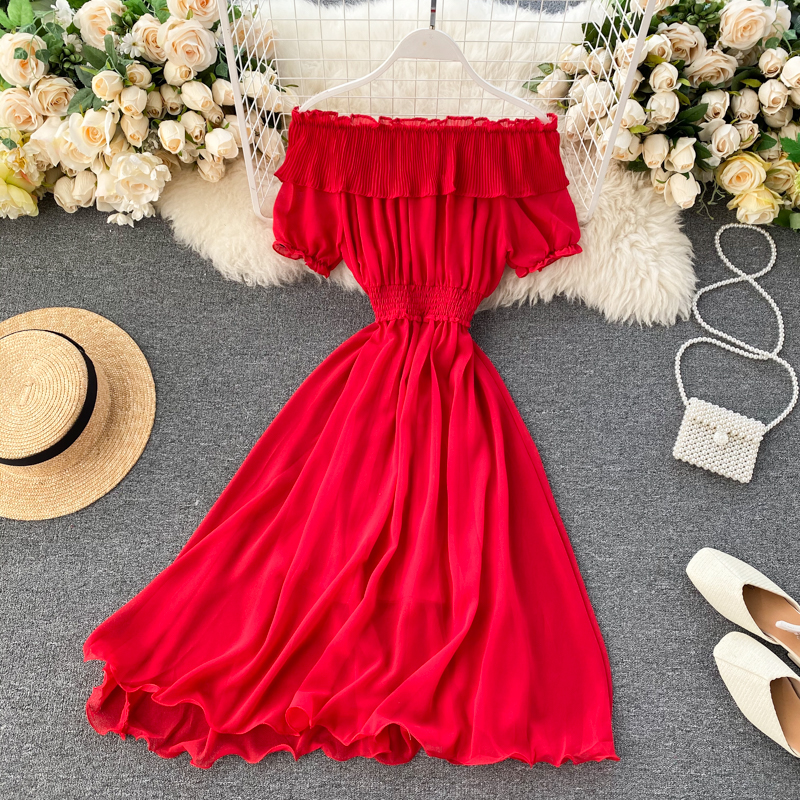 Summer Vacation Beach Knee-length Chiffon Dress Sexy Slash Neck Ruffle High Waist Yellow/White/Blue Short Sleeve Dress New