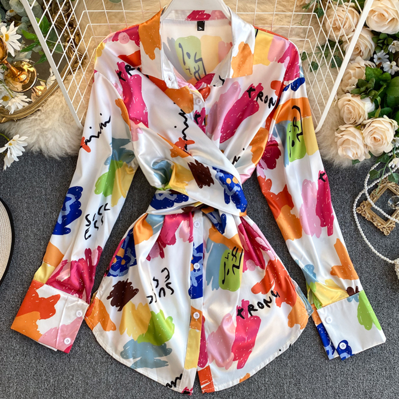 Spring Turn-Down Collar Long Sleeve Satin Tops Women Casual Single Breasted Irregular Lace Up Bandage Slim Shirts Female