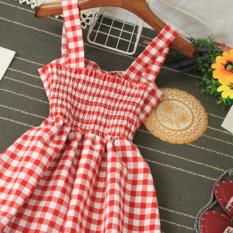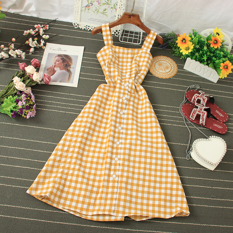Vintage Plaid Spaghetti Strap Dress Women Slash Neck High Waist Red/Yellow/Green Single Breasted A-line Dress Female New