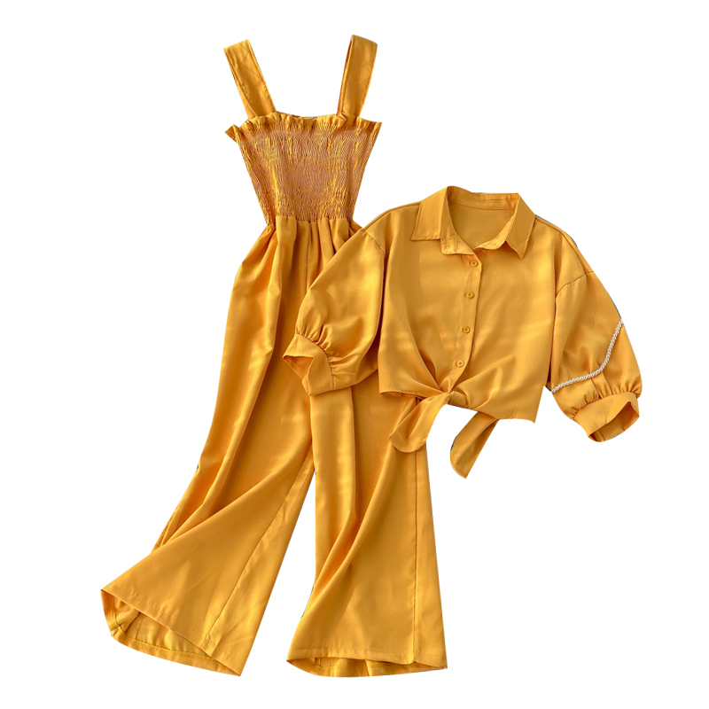 Vintage Women 2pcs Set Suit Elegant Half Sleeve Single Breasted Short Blouse + Strap Rompers Autumn Two Piece Sets Fashion