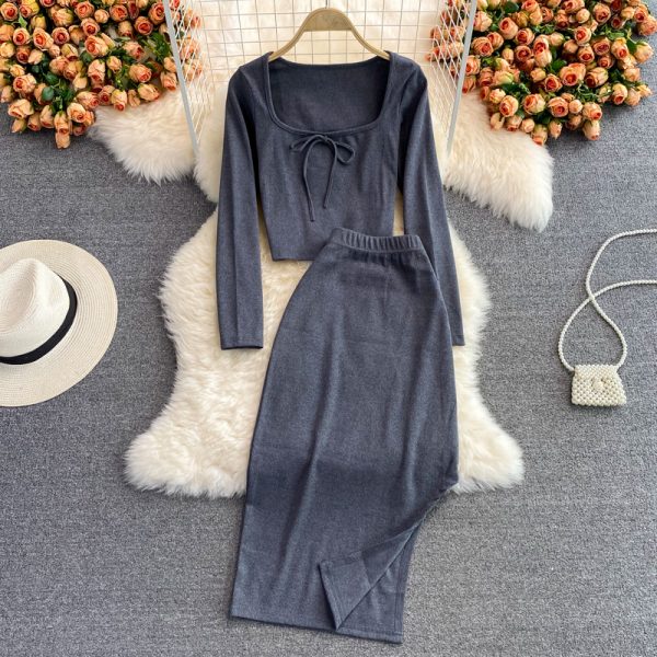 Autumn Casual Knitted Two Piece Set Women Gray/Black Square Collar Long Sleeve Short Tops + High Waist Bodycon Skirt Female