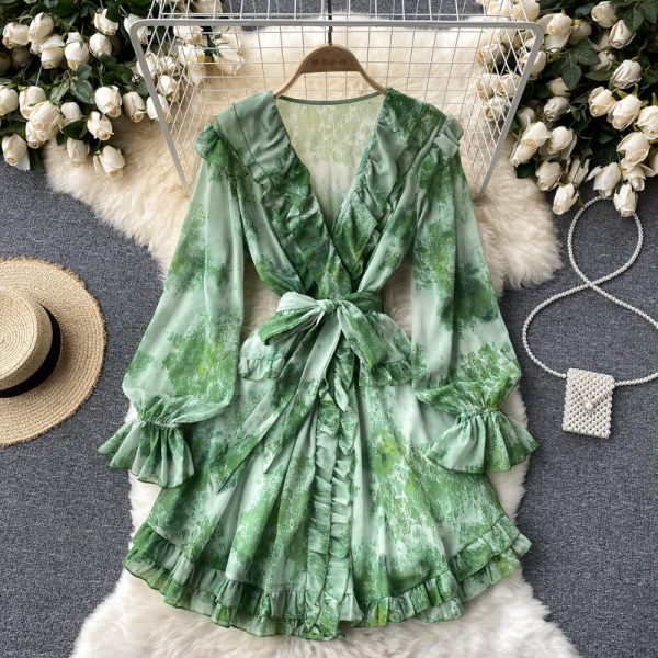 Autumn Blue Tie-Dye Mini Dress Women Sweet Ruffle Chiffon Vestidos Female Elegant Flare Long Sleeve Irregular Robe Fashion