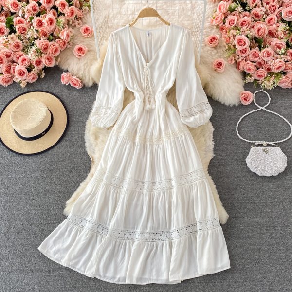 Autumn Sexy Hollow Out Beach Long Dress For Women White V-Neck Puff Sleeve Bandage Maxi Vestidos Elegant Club Party Robe