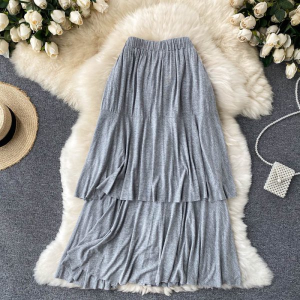 Autumn Gray/Black Ruffle Midi Skirt Women Vintage High Elastic Waist A-Line Faldas Female Slim Casual Saia New Fashion