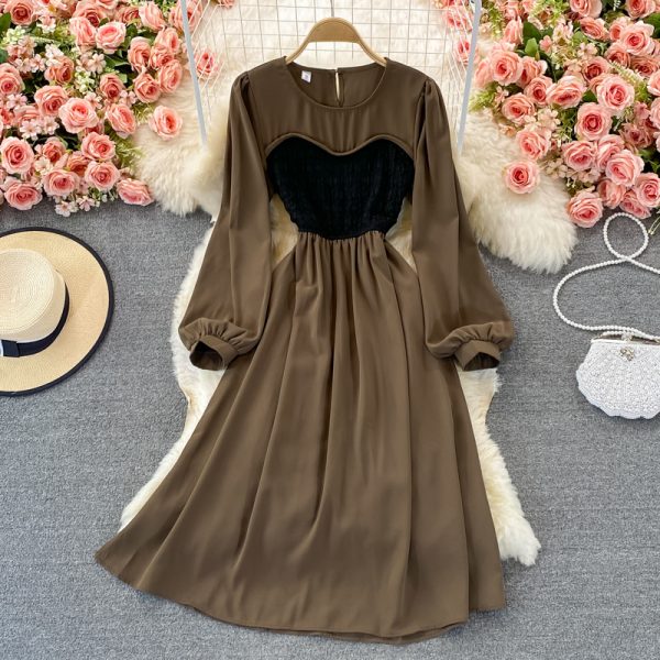 Autumn Brown/Beige/Black Patchwork Midi Dress Women Vintage Puff Long Sleeve High Waist A-Line Party Vestidos Casual Robe
