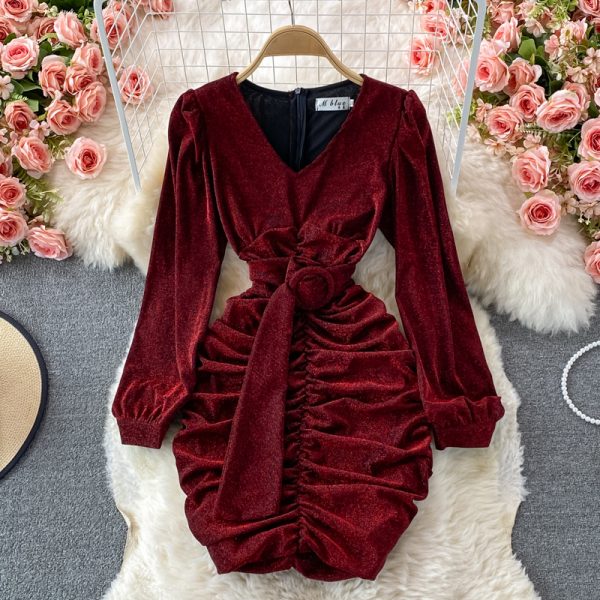 Autumn Red/Brown/Black Draped Bodycon Dress Women Sexy V-Neck Puff Long Sleeve High Waist Party Vestidos Female New Fashion