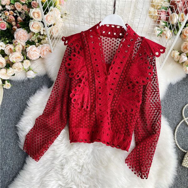 Autumn Sexy V-Neck Hollow Out Lace Blouse Women Casual Pink/White/Red Shirts Female Elegant Long Sleeve Tops New Fashion Blusas
